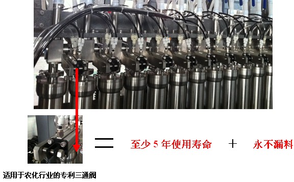 3、根據(jù)高粘度灌裝機(jī)5年的研發(fā)經(jīng)驗(yàn)及市場反饋,我公司自行成功研發(fā)出更適合農(nóng)化行業(yè)的灌裝三通閥。該三通閥結(jié)構(gòu)簡單、性能可靠,很大的優(yōu)點(diǎn)在于使用壽命長,密封可靠,長時(shí)間使用后不漏料。目前該三通閥技術(shù)是我公司的特有專li。