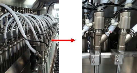 4、氣缸帶動灌裝頭運(yùn)行的下潛灌裝方式,配合可設(shè)定的變速灌裝功能,可降低易起泡物料在灌裝時(shí)泡沫的產(chǎn)生,防止物料外溢造成的瓶口污染。同時(shí)將灌裝頭下潛的氣缸動作機(jī)構(gòu)移到積液水盤的下方,防止外濺物料對氣缸等零件的腐蝕,目前只有我公司采用這種專li機(jī)構(gòu)。