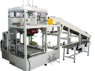 4)整形完成后,輸送機(jī)開(kāi)始啟動(dòng),把裝箱好的產(chǎn)品輸送到自動(dòng)折蓋封箱機(jī)處,光電開(kāi)關(guān)感測(cè)到紙箱到來(lái)后,自動(dòng)把紙箱上蓋折疊,同時(shí)封上膠帶。