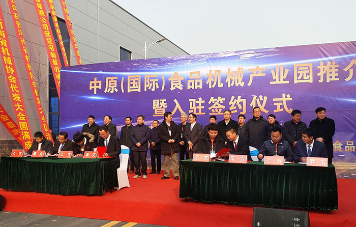 星火包裝機(jī)董事長(zhǎng)郭先鋒(右二)正與中原食品機(jī)械產(chǎn)業(yè)園簽約