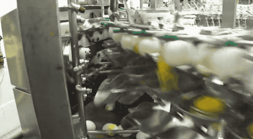 我們都知道,不管哪種蛋黃醬,主原料都是雞蛋和油,但配方千變?nèi)f化,各家都有自己的秘制配方。以前的蛋黃醬只使用蛋黃,現(xiàn)在也有使用全蛋液的配方出現(xiàn)。注意,做蛋黃醬,用的是生雞蛋液以及一整個油罐車的大豆油。所謂蛋黃醬,其主體就蛋黃,所以在工廠里首先做的就是分離蛋清蛋黃: