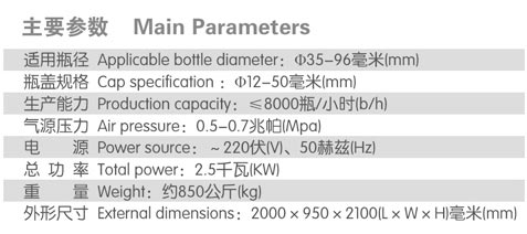 適用不同規(guī)格圓瓶、方瓶的外蓋自動旋合,具有結(jié)構(gòu)緊湊、操作簡單,調(diào)整規(guī)格方便快捷的特點。