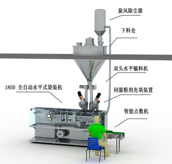 說(shuō)明:此種方式采用兩臺(tái)螺桿上料機(jī),跟主機(jī)在同一個(gè)區(qū)域中,這樣相對(duì)工作區(qū)中的粉塵比較難控制,且螺桿上料機(jī)的儲(chǔ)料斗相對(duì)較小,需要頻繁的加料;此種方式主要針對(duì)那些廠房位置已經(jīng)固定了或者是臨時(shí)性的使用;本機(jī)可以包裝單袋和雙聯(lián)袋,安裝兩只上料機(jī)也可以包裝兩種不同的物料。