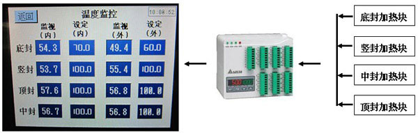 各加熱封塊的溫度由PLC進(jìn)行集中控制、統(tǒng)一管理。溫度設(shè)定可直接在觸摸屏中操作,方便、快捷。比其他廠家采用溫控表控制溫度的方法更可靠,更安全。同時(shí)降低了用戶的維護(hù)成本—不會(huì)因?yàn)闇乜乇淼膿p壞而購(gòu)買(mǎi)配件。
