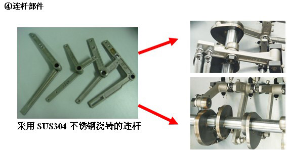 本機(jī)所有連桿部件采用SUS304不銹鋼鑄件,牢固性強(qiáng),不變形。而其他廠家一般采用焊接連桿,這種連桿容易斷裂、且容易變形。