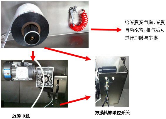 采用新式氣脹軸式放膜機(jī)構(gòu),替代原先手工裝膜、卸膜,減少勞動(dòng)強(qiáng)度,方便快捷。該裝置并具有防倒卷檢測(cè)功能,出現(xiàn)異常自動(dòng)停機(jī)。
